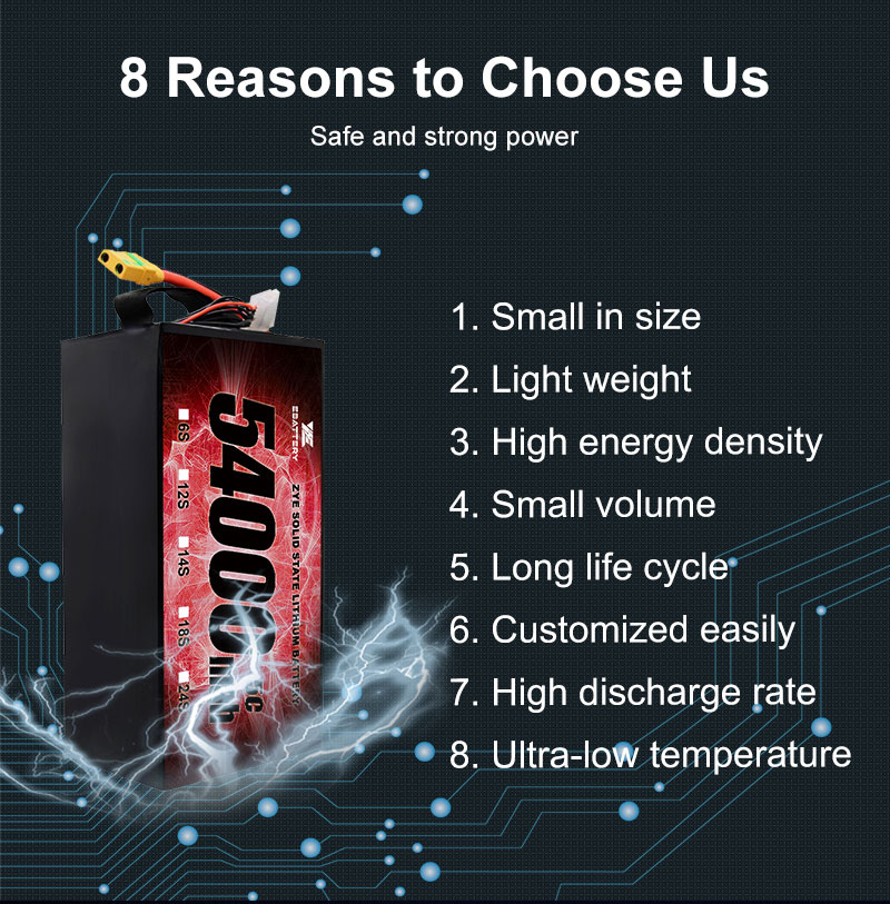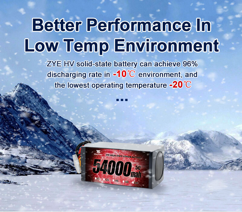 Üle 10-aastase liitiumakude tootmise kogemusega pakume tipptasemel 54000 mAh akusid, mis on tuntud oma vastupidavuse, kerge disaini ja suure energiatiheduse poolest. ZYE pakub teie vajadustele kohandatud usaldusväärseid toitelahendusi, olgu see siis lennunduse, mehitamata õhusõidukite, robootika või tööstuslike rakenduste jaoks.
